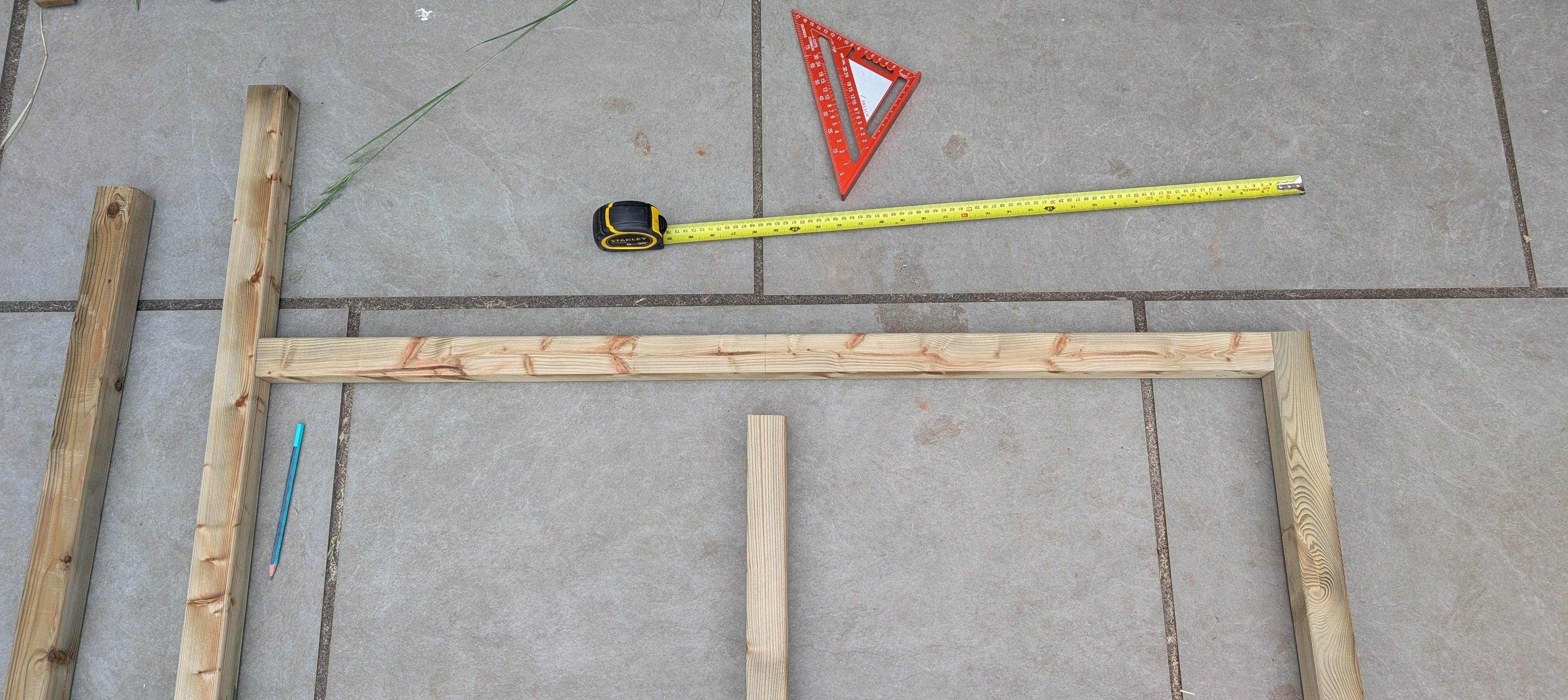 The freshly cut support piece didn’t fit. It was miles out… I couldn’t see the issue, so I put the frame on top of the finished one, and it stood out like a saw thumb. I’d nailed the top beam in completely out of square…
