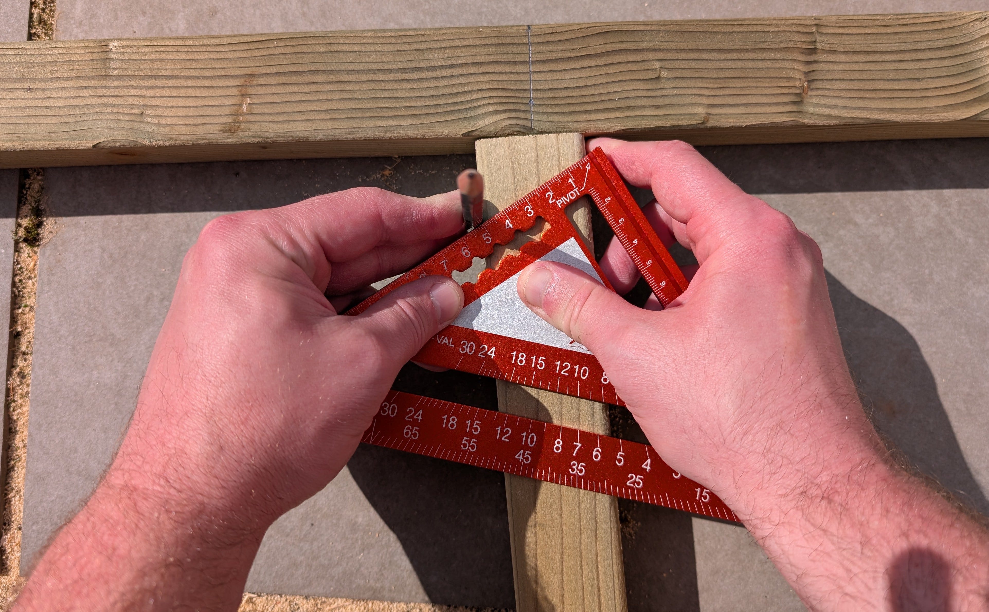 You can do this with a ruler or even a tape measure, but the pivot point on the carpenter’s square makes it so much easier!