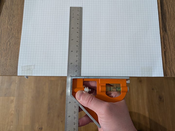 Set up a piece of paper along a known square edge. I've used my dining table. I taped the paper to the table to make sure it doesn't move around.
